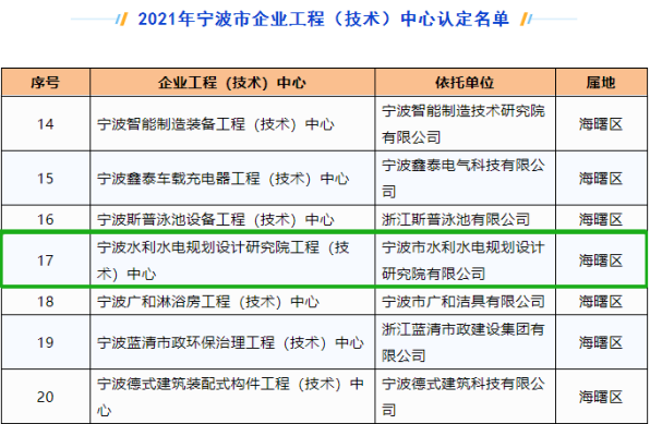 近日,寧波市發(fā)展和改革委員會、寧波市經(jīng)濟(jì)和信息化局、寧波市財政局、寧波市科學(xué)技術(shù)局聯(lián)合發(fā)文,公布2021年寧波市企業(yè)工程(技術(shù))中心認(rèn)定名單。我院為主體申報的“寧波水利水電規(guī)劃設(shè)計研究院工程(技術(shù))中心”赫然在列,這是我院在水利水電規(guī)劃設(shè)計領(lǐng)域的技術(shù)實(shí)力得到認(rèn)可的體現(xiàn)。